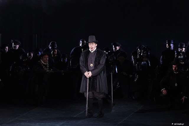 τέταρτης πράξης, μόνο με μία σειρά φρουρών γυρισμένων πλάτη, με πλάτη φωτισμένες τις αστραφτερές πανοπλίες τους -τι πιο υποβλητικό; Η κινησιολογία, που υπογράφει η Βρετανίδα Σκάρλετ Μακμίν, επίσης αποτελεσματική. Ο εξαίρετος γάλος αρχιμουσικός Φιλίπ Ογκέν, «Φιλοξενούμενος Καλλιτέχνης» για φέτος στην Λυρική, οδηγεί, από το πόντιουμ, την Ορχήστρα της Εθνικής Λυρικής Σκηνής, την Χορωδία της που διευθύνει ο Αγαθάγγελος Γεωργακάτος και την υπό τον Εσθονό Γιάαν Οτς μπάντα σε ένα σημαντικό επίτευγμα ενταγμένο απόλυτα στο βερντιάνικο ύφος. Η παράσταση ευτυχεί και στη διανομή -είδα και τις δύο διανομές. Η ιταλίδα σοπράνο Μπάρμπαρα Φρίτολι, αν και κάπως ώριμη πια για το ρόλο της