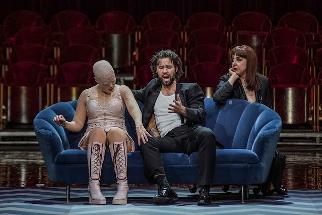 βουλιαγμένου σκηνικού της Ελένης Μανωλοπούλου, ιδανικά για την ατμόσφαιρα της παράστασης, ενισχυμένα από τους καίριους φωτισμούς του Αλέκου Αναστασίου και τα βίντεο του Χρήστου Δήμα, και, αντιστικτικά, τα κοστούμια της, λαμπερά και πλούσια, για τα οποία δεν έχει φεισθεί η παραγωγή, και που δίνουν ακριβώς την ψευδαίσθηση του «λεφτά υπάρχουν» -λεφτά αγνώστου προελεύσεως...-
